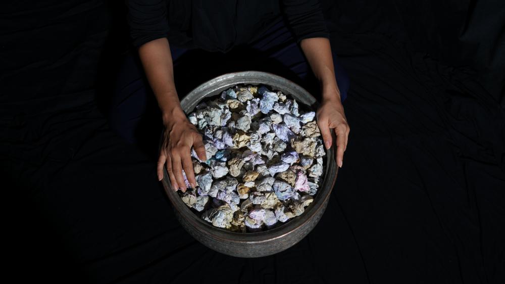Ideas and thoughts, recorded and preserved in notebooks for years, The moment of revision and selection.They are purified in a ritual and revived in a new form within vitalizing waters. The abstract space of the mind, once transferred to paper and tempered by time, now transforms into a solid and mysterious entity.